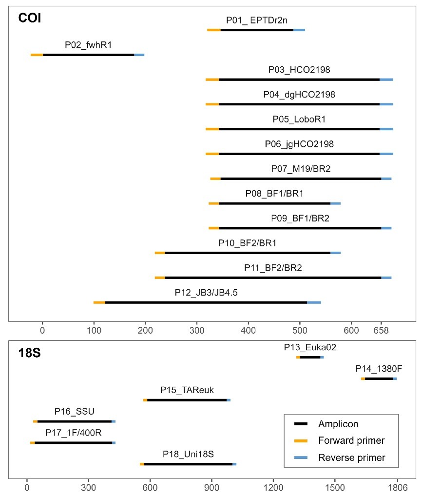 针对这一问题,本研究利用来自中国多条河流、湖泊及沿海水体的eDNA样本(图1),通过计算机模拟(in silico)与实际PCR实验(in vitro)相结合的方法,全面评估了12对靶向线粒体COI基因和6对靶向核18S rRNA基因的无脊椎动物通用引物(图2),比较分析了这些引物在物种特异性、覆盖度、分辨率和偏好性等方面的表现。