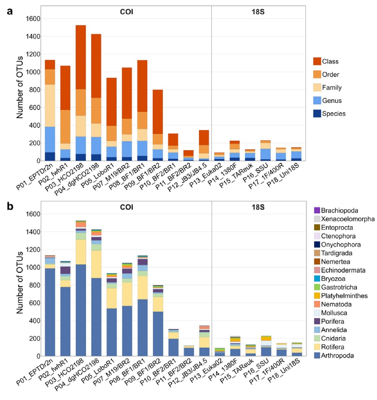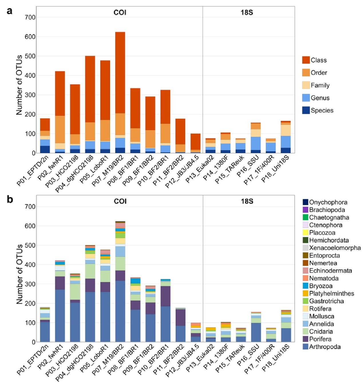 在分类覆盖度方面,COI引物检出的无脊椎动物分类单元(OTU)数量显著高于 18S引物:COI引物在淡水eDNA 样本中检出91–1524个无脊椎动物OTU(图4),在海洋样本中检出74–624个(图5),但分类分辨率均较低。引物P03_HCO2198和P04_dgHCO2198在淡水生境中检出的OTU数量最多,而P07_M19/BR2在海洋生境中表现最佳,显示最优引物选择受到研究环境和生物组成的影响。18S引物虽普遍检出的总OTU较少,但部分引物(如P14_1380F)能覆盖更广泛的无脊椎动物门类,可作为COI引物的有效补充。