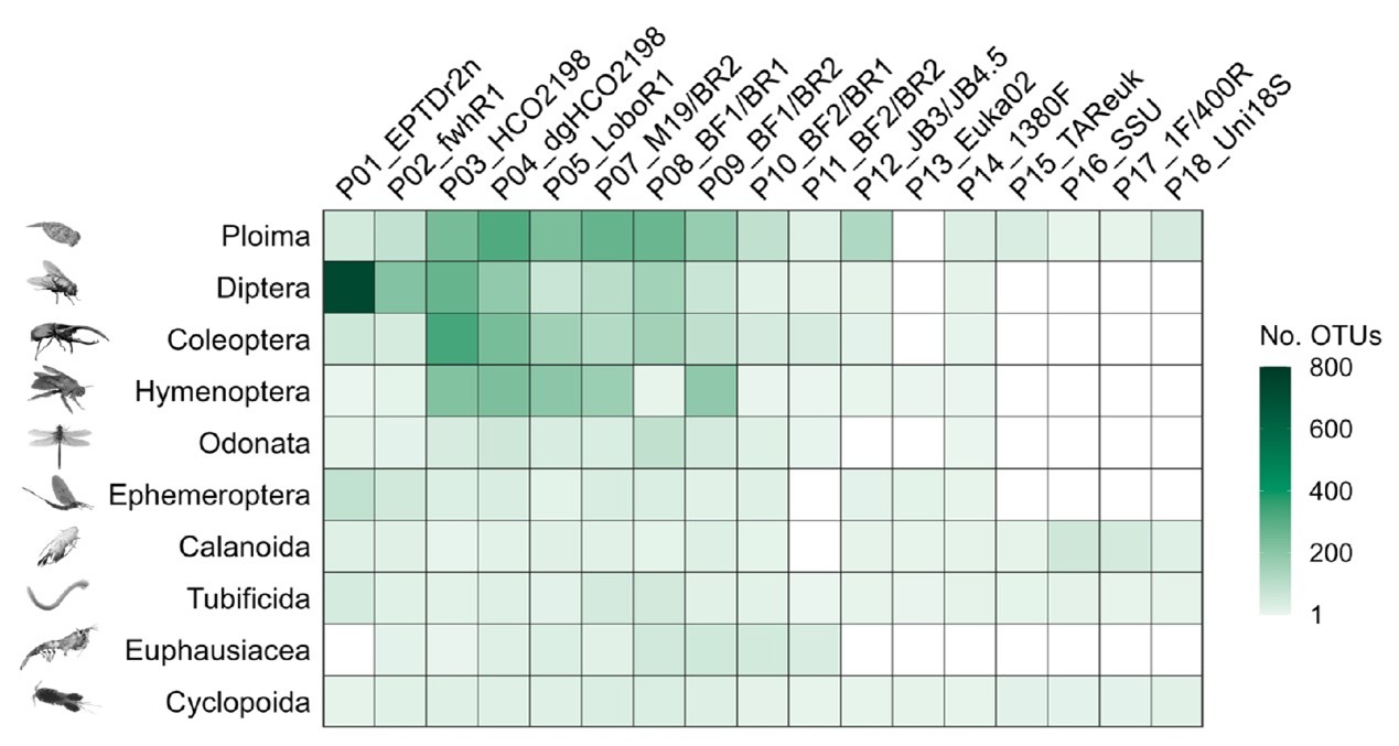 图6. 基于淡水eDNA样本in vitro分析的主要无脊椎动物目级OTU丰度热图