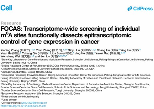 2025年12月31日,冰球突破mg正规官网、北大-清华生命科学联合中心、冰球突破mg正规官网核糖核酸北京研究中心刘君课题组在Cell发表了题为“FOCAS: Transcriptome-wide screening of individual m6A sites functionally dissects epitranscriptomic control of gene expression in cancer”的研究论文。该研究建立了FOCAS(Functional m6A Sites Detection by CRISPR-dCas13b-FTO Screening)方法,实现了m6A功能研究在位点分辨率上的关键突破。FOCAS基于改造的CRISPR-dCas13b系统,将去甲基化酶FTO精准定位至RNA特定区域,从而在不改变DNA/RNA序列和不显著影响全局m6A水平的前提下,实现对特定m6A修饰位点的靶向去甲基化。这一策略不仅适用于mRNA,还可以同时覆盖非编码RNA,为在全转录组尺度上系统解析m6A的功能提供了技术基础。