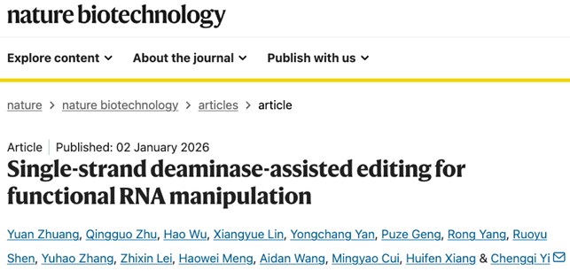 2026年1月2日,冰球突破mg正规官网伊成器课题组在Nature Biotechnology在线发表了题为Single-strand deaminase-assisted editing for functional RNA manipulation的研究论文。该研究建立了由单链脱氨酶辅助的可调节RNA信息操纵平台AIM(adjustable RNA information manipulation)。该平台突破了目前RNA碱基编辑工具“单点编辑”的限制,实现了在RNA靶向区域内对不同数量、多种类型碱基的可控与精准操纵,为RNA功能研究与疾病干预提供了强大的底层技术支撑。