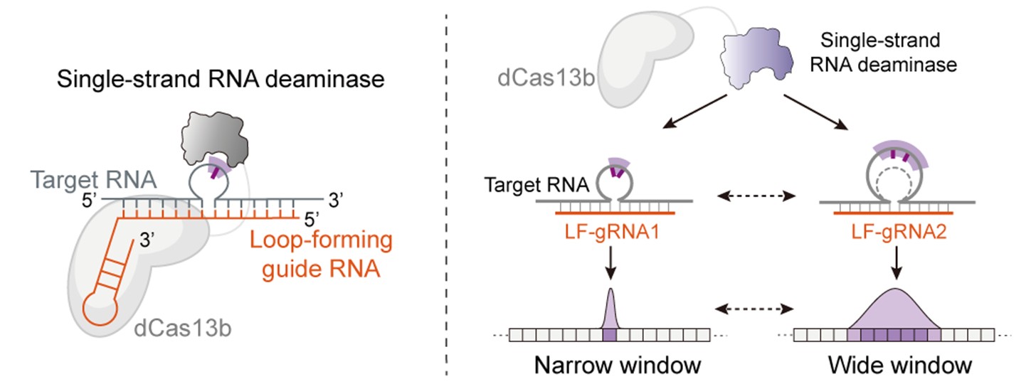 AIM平台由RNA靶向的dCas13蛋白、单链RNA脱氨酶TadA,以及特殊设计的可成环向导RNA(loop-forming gRNA,LF-gRNA)组成。LF-gRNA能够在目标RNA上诱导形成一个局部单链的“环区”,使其中的碱基充分暴露,成为单链脱氨酶作用的有效底物;同时,环区两侧由LF-gRNA与靶RNA互补配对形成双链结构,可有效阻止非目标位点的编辑。通过改变LF-gRNA诱导的单链环区的大小,可以实现对RNA编辑窗口尺寸的灵活且可控调节。