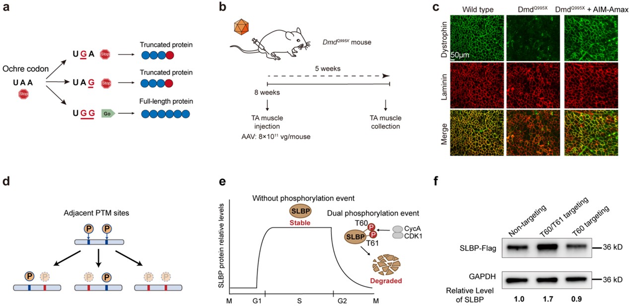 依托AIM平台“多位点、多功能”的编辑特性,研究团队完成了现有RNA编辑工具难以实现的应用。首先,AIM的多位点编辑能力在提前终止密码子UAA的通读中展现出独特优势。利用AIM-Amax系统,研究团队成功在同一密码子内实现两个A碱基的同时编辑,从而在多个转录本上实现了UAA提前终止密码子的通读。随后,在囊性纤维化细胞模型以及杜氏肌营养不良小鼠模型中,研究团队检测到全长蛋白表达和功能恢复,展示了AIM平台在疾病治疗方面的应用潜力。此外,研究团队还将AIM应用于操纵与蛋白翻译后修饰相关的RNA信息。蛋白质翻译后修饰具有动态性和可逆性,这一特点使其成为通过RNA编辑工具进行功能干预的理想对象。研究团队利用AIM在RNA水平对单个或相邻的关键磷酸化相关密码子进行改写,从而实现对蛋白质稳定性的调控。