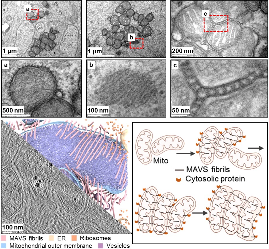 天然免疫是宿主抵抗病原微生物入侵的第一道防线,必须在感染早期被快速激活降低感染造成的机体损害。已知极微量的RNA病毒感染细胞后即可激活其受体RIG-I,并在1小时内诱导细胞内I型干扰素的转录。定位于线粒体外膜的MAVS是RIG-I下游的唯一接头蛋白,负责招募下游信号分子。MAVS如何在胞内线粒体膜上聚集并在线粒体间快速传递信号及后续猝灭是领域内重要的未解之谜。此前研究表明MAVS的CARD结构域在体外可形成朊病毒样纤维,并能“传染”激活静息MAVS蛋白,但其在细胞内的真实结构及功能实现方式一直不明确。