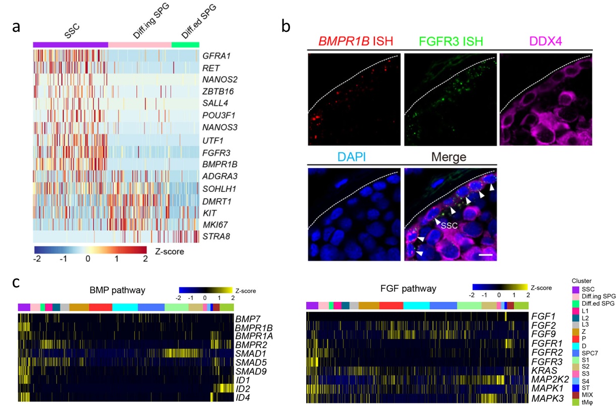 图2:精原细胞的基因表达调控(a)精原细胞阶段特异标志基因的表达热图;(b)睾丸组织BMPR1B、FGFR3的RNA原位杂交与DDX4的免疫荧光染色定位;(c)BMP、FGF信号通路关键基因的表达热图