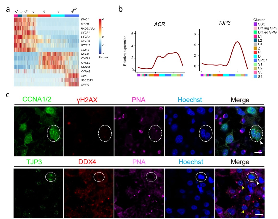 图3:精母细胞的基因表达调控(a)精母细胞阶段特异标志基因的表达热图;(b)ACR、TJP3的表达图;(c)CCNA1/2、PNA、γH2AX和DDX4在SPC7中的表达特征