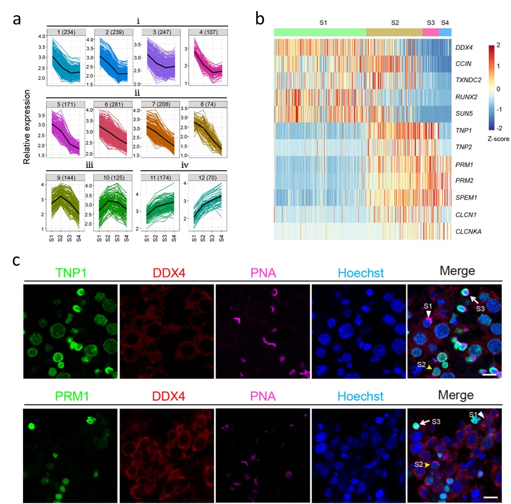 图4:精子成熟过程的基因表达调控(a)与人类精子细胞成熟相关的4类基因;(b)精子细胞阶段特异标志基因的表达热图;(c)DDX4、TNP1、PRM1、PNA在人类精子细胞中的表达特征
