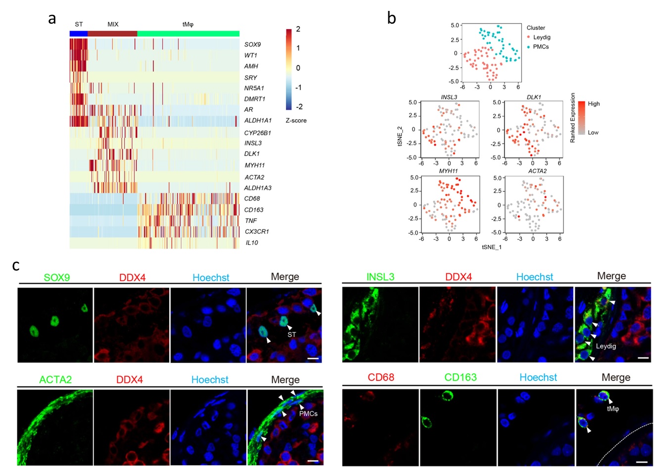 t-SNE分析发现人类睾丸中的体细胞主要分为三大类:支持细胞(ST)、MIX细胞、以及睾丸巨噬细胞(tMφ)。支持细胞中高度富集视黄酸合成相关基因(ALDH1A1),视黄酸通过旁分泌途径诱导精原细胞表达STRA8,使其进入减数分裂(图5a)。而MIX细胞在基因表达水平上存在较大的异质性,通过t-SNE对MIX进行重新分群,发现MIX包含表达INSL3、DLK1的间质细胞和表达MYH11、ACTA2的管周肌样细胞(图5b)。免疫荧光定位检测证实了人类睾丸组织中的体细胞微环境主要由支持细胞、间质细胞、管周肌样细胞和睾丸巨噬细胞共同形成(图5c)。人类睾丸体细胞主要参与性激素合成、减数分裂的启动、细胞间的粘附与迁移,以及睾丸内的免疫反应,尤其是睾丸巨噬细胞,这类很少被关注到的细胞类型将为探索人类睾丸微环境稳态的维持提供新的研究思路。