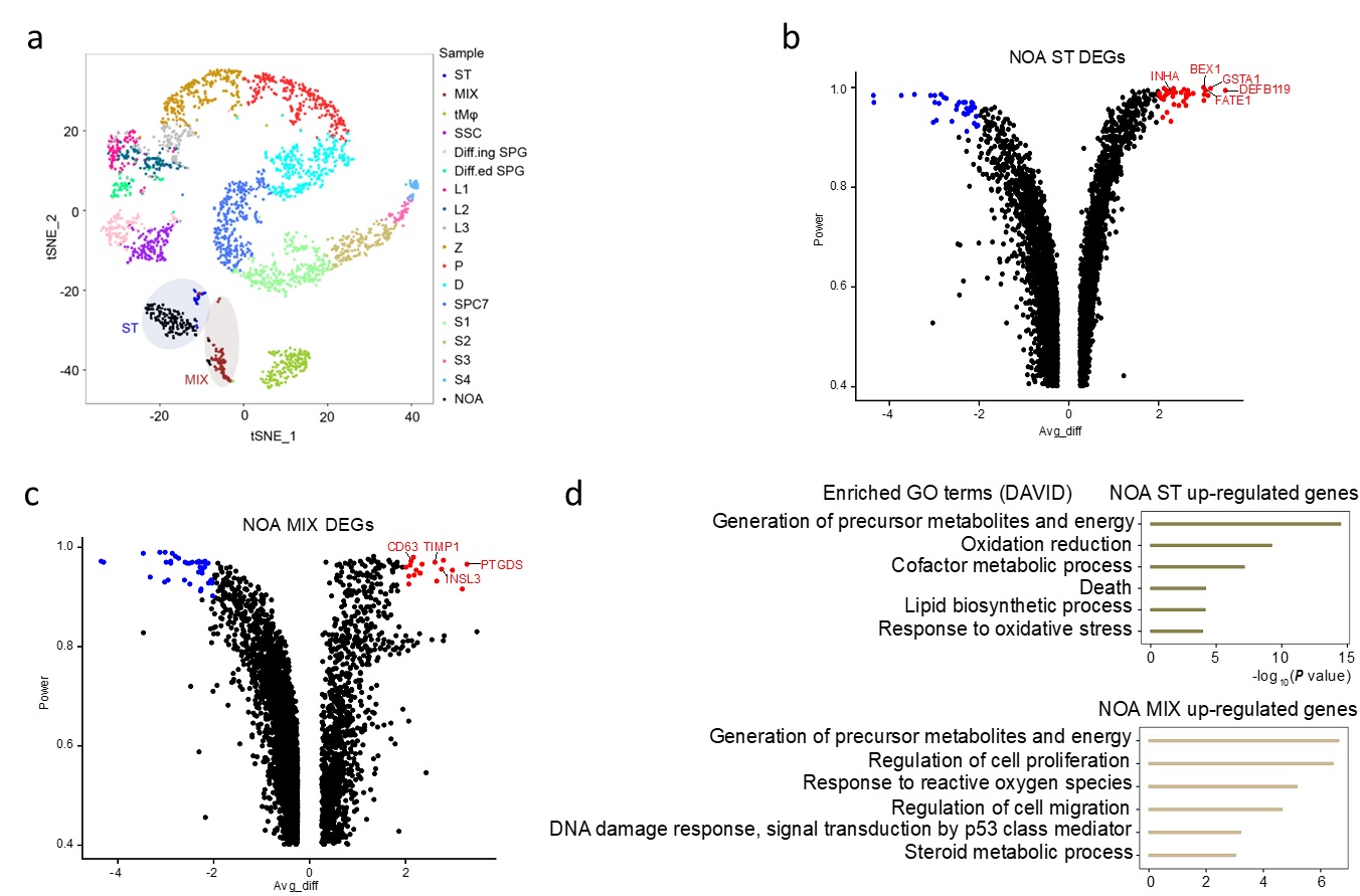 图6:无精症睾丸细胞的基因表达调控(a)生精上皮完整男性的2,854个睾丸细胞及NOA患者的174个睾丸细胞组成的t-SNE图;(b)NOA患者与生精上皮完整男性支持细胞的差异基因火山图;(c)NOA患者与生精上皮完整男性MIX细胞的差异基因火山图;(d)NOA患者的睾丸体细胞上调基因中富集的生物学过程