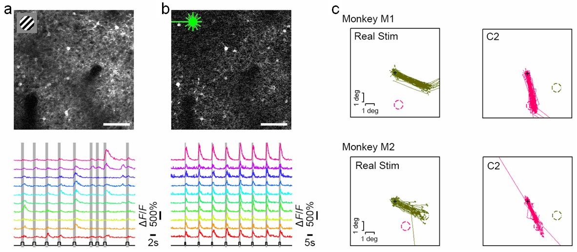 (a)真实视觉刺激(运动光栅或颜色)产生的视皮层神经元活动;(b)激光刺激表达光敏感通道蛋白的视觉皮层神经元产生的神经活动;(c)真实视觉刺激和激光植入的虚拟视知觉产生了相同的行为效应(眼动扫视)。