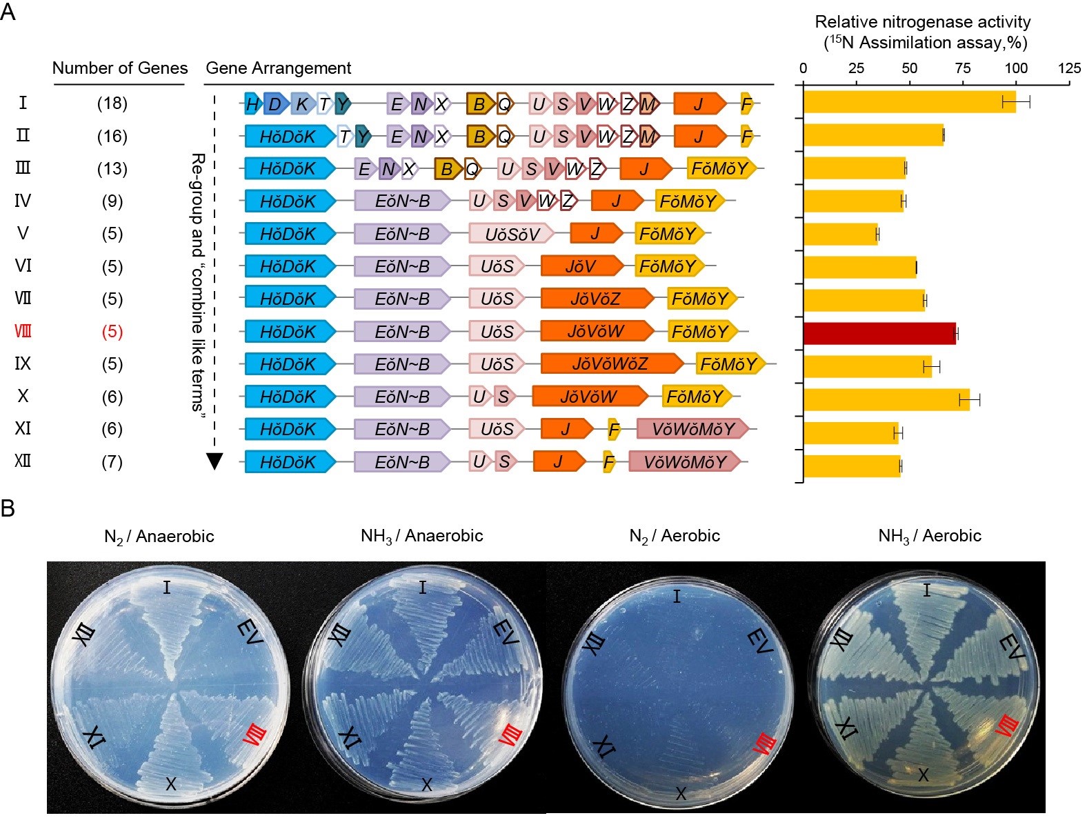 附图:(A)固氮酶系统再分组及逐一合并“同类项”过程示意图;(B)5个编码Polyprotein的巨型基因构成的固氮酶系统(VIII)支持大肠杆菌以氮气为唯一氮源生长。