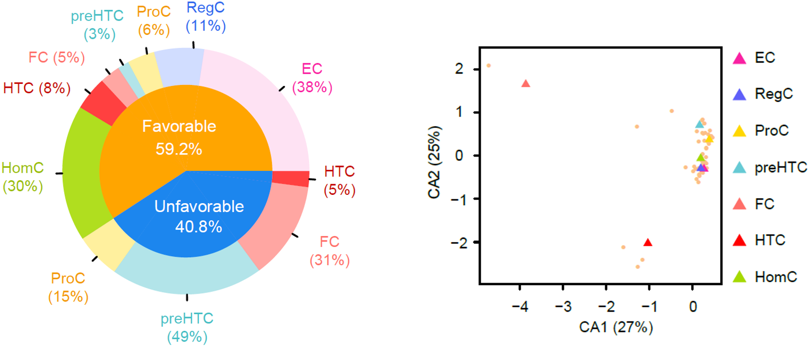 正相关和负相关预测基因在不同软骨细胞类群中的分布,CA分析推测不同细胞类群对病程的影响