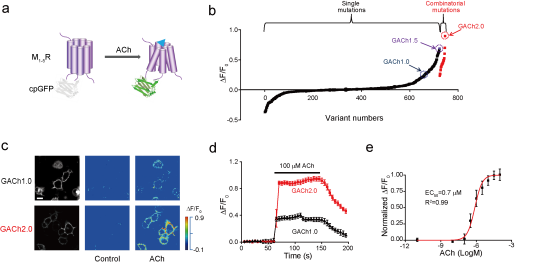 与其从头设计,不如借鉴大自然的鬼斧神工。该研究首次通过对于神经递质特异的G蛋白偶联受体(GPCR)进行改造,通过在特定位置嵌入循环重排的荧光蛋白14,将受体在被神经递质激活后的构象变化转变为荧光蛋白荧光信号的变化,进而反映对应神经递质的浓度变化。通过对于乙酰胆碱受体的改造以及一系列突变筛选和优化,该研究获得对于乙酰胆碱具有灵敏光学响应的荧光探针,其对于生理浓度乙酰胆碱具有高信噪比的光学信号变化,并且具有亚秒级的反应速度以及良好的分子特异性,可实现时空特异的对于乙酰胆碱信号的精确指征。