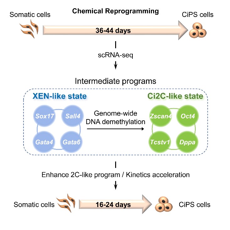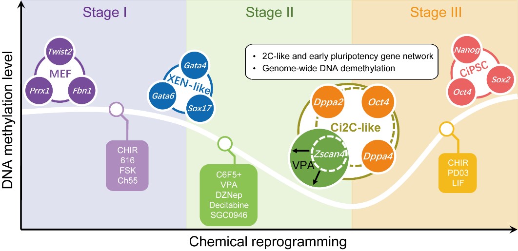 多潜能干细胞由于其无限的自我更新能力和分化产生机体所有细胞类型的潜能,在疾病模型、药物筛选和细胞治疗等领域具有广泛的应用前景,而如何在体外诱导获得多潜能干细胞一直是生命科学领域的关键科学问题。2013年,邓宏魁研究组在《Science》杂志上报道了重大突破,首次利用小分子化合物将体细胞重编程为多潜能干细胞(chemically induced pluripotent stem cell, CiPSC)。这项成果提供了更加简单和安全有效的方式来重新赋予成体细胞 “多潜能性”,开辟了一条新的途径实现体细胞重编程,为未来细胞治疗及人造器官提供了理想的细胞来源,给未来应用再生医学治疗重大疾病带来了新的可能。2015年和2017年,邓宏魁研究组又相继在《Cell》和《Cell Stem Cell》等杂志上发表文章,阐明了化学重编程早期经历了一个类似胚胎早期发育中胚外内胚层(extraembryonic endoderm,XEN-like)的中间状态,并通过促进该状态的产生显著提高了重编程效率。随后,包括谢欣、姚红杰、裴端卿、刘林等多个研究组利用相同或类似的小分子化合物组合,重复和优化了化学重编程技术。然而,XEN-like细胞是如何逐步建立完整多能性调控网络转变为CiPS细胞的这一关键问题,尚不清楚。