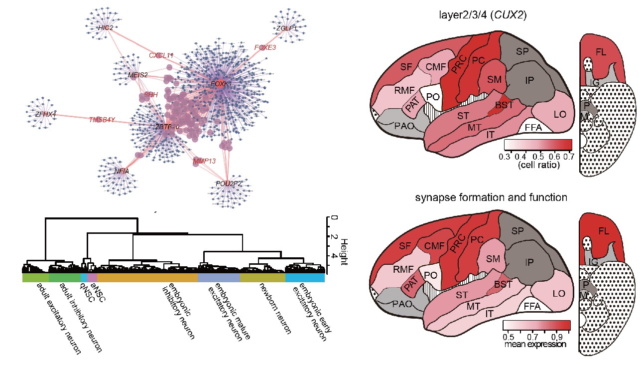 该研究发现人类大脑皮层的区域差异性首先体现在各种类型细胞的组成比例不同,特别是神经元和胶质细胞组成比例的显著不同上。在额叶区域以兴奋性神经元为主而在颞叶区域以抑制性神经元为主,皮层下侧的脑区则主要富集神经胶质细胞,这为不同脑区神经信号网络的差异提供了细胞基础。兴奋性神经元与起源自原始神经节的抑制性神经元在发育调控上有着截然不同的特征,前者是一个连续成熟的异步分化发生过程,而后者则在发育上比较同步,同一发育时期大脑皮层中不同抑制性神经元的成熟度比较一致,异质性很小。通过对兴奋性神经元细胞发育过程的深入分析,鉴定了调控大脑皮层神经元成熟的关键候选转录因子,为体外神经元定向诱导分化提供了参考。