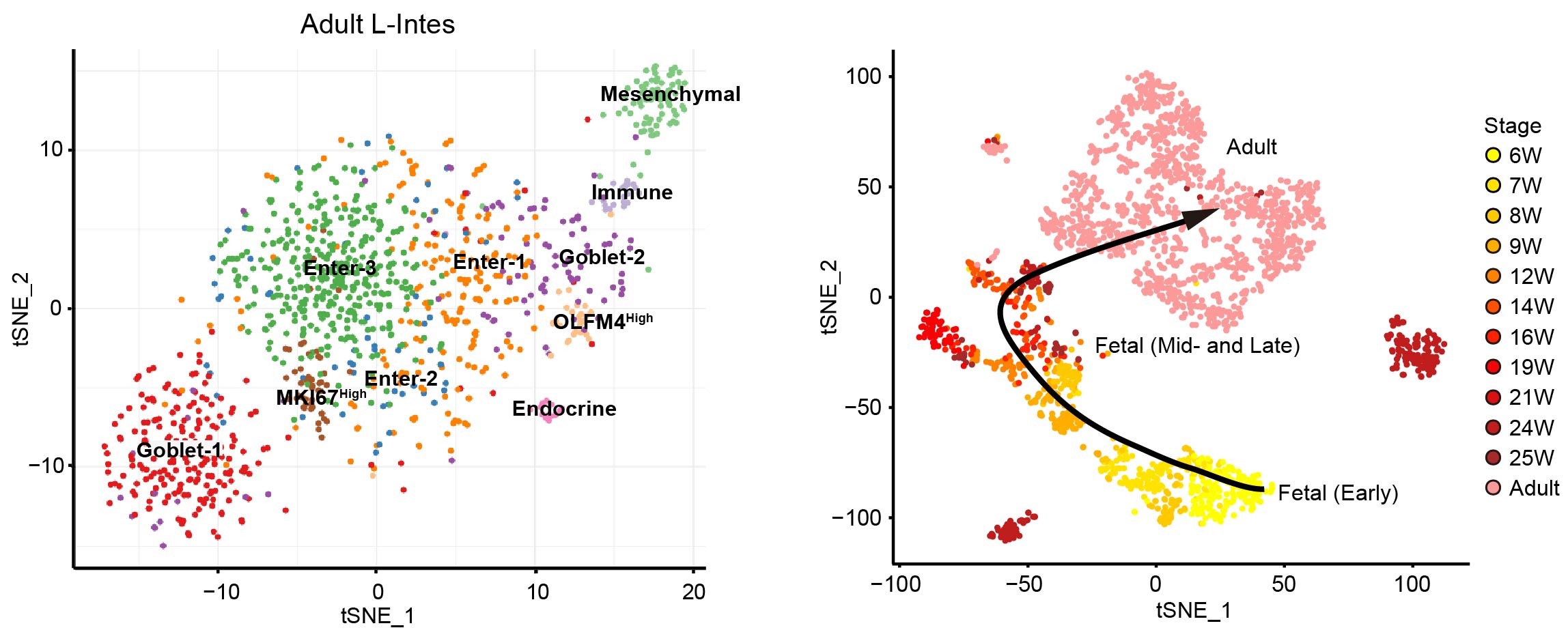 (4)针对大肠的发育进程,该研究进一步获取了成年人大肠高精度的单细胞转录组数据,首次系统地研究了大肠从胎儿到成人的发育过程,成年人大肠中10种主要的细胞类型都被精确地鉴定出来。该研究系统地揭示了包括大肠干、祖细胞,肠上皮细胞,杯状细胞等功能成熟的细胞类型的核心基因表达模式和关键标志基因等重要生物学特征。在胎儿发育的后期,大肠中的细胞类型以及其基因表达模式与成年人阶段已经很接近,其中一些特定细胞类型的关键基因的表达也都趋于一致,说明在胚胎晚期大肠的主要细胞类型可能已经具备了初步的食物消化和营养吸收功能。