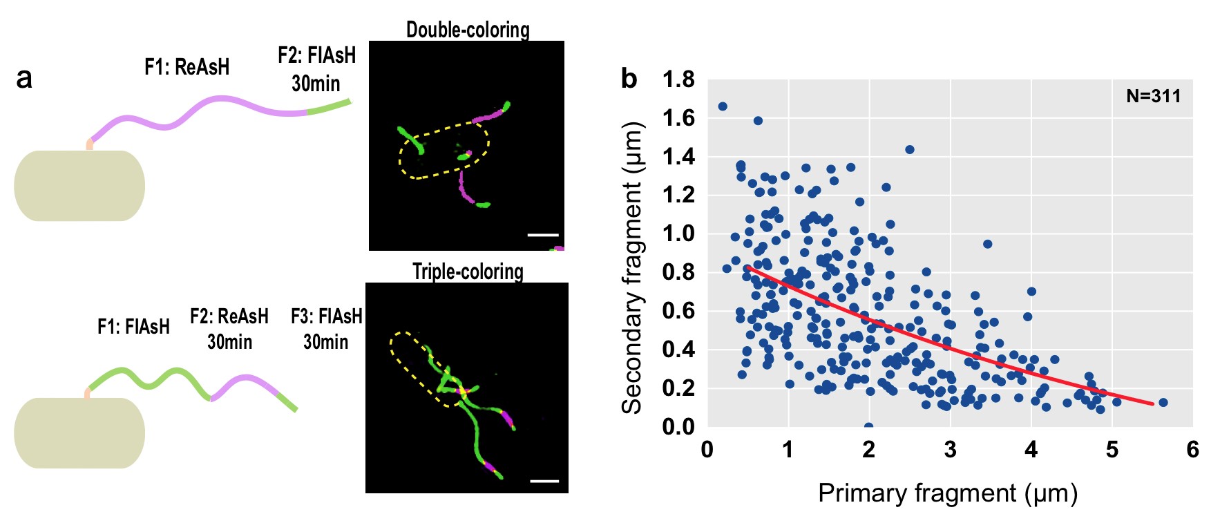 大肠杆菌依靠鞭毛的旋转进行游动,但其鞭毛的生长过程至今尚未研究清楚。过去通过群体测量得到的数据认为,大肠杆菌鞭毛的生长速率恒定不变。近年来荧光成像技术的进步,丰富了对鞭毛生长模式的研究手段。本文中,研究人员在大肠杆菌的鞭毛亚基——FliC蛋白中插入了四个半胱氨酸标签,并运用FlAsH/ReAsH荧光染料对鞭毛进行标记,结合实时荧光显微成像技术和结构光照明超分辨成像技术,探究了大肠杆菌鞭毛生长模式以及同一细菌上多根鞭毛之间生长速率的关系。