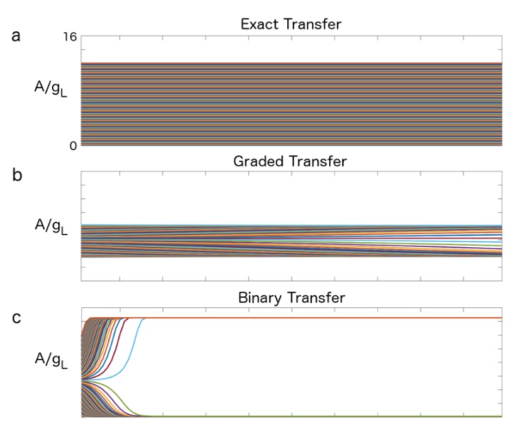 该研究在对神经网络的高维动力系统做了一系列解析简化后,探索了不同参数下网络的信道容量变化。在这一工作中,利用互信息度量,研究者发现了前馈环路里的三种传输模式:信息丢失(degenerate/unitary),二元传输(binary),定量传输(graded transfer)。而且,通过改变门控电流的强度和方差,就可以在不同模式间进行切换,因而产生了一个可控的信息通道。