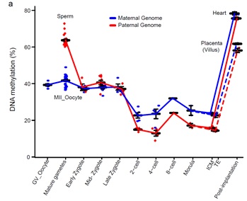 图一.人类早期胚胎发育过程中的DNA甲基化组重编程