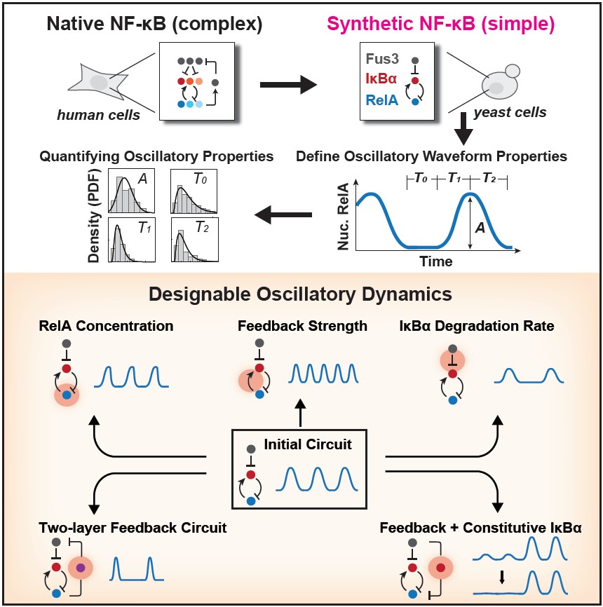 NF-κB是高等真核细胞中调节免疫、发育、细胞凋亡等许多重要过程的关键信号控制系统。然而有趣的是,在低等真核细胞酵母中,与NF-κB相关的所有分子组分均不存在。魏平课题组利用这一特性,将人源的NF-κB系统在酵母细胞中重构,从头设计了负反馈调控,得到了一种能够稳定振荡的人工NF-κB。他们通过定义振荡波形的量化概念,为调控振荡动力学行为提供了定量的指标。依赖该人工设计系统高度的正交性与可调性,研究小组建立了精确的网络数学模型,模拟并预测出一种特殊的巢式双层负反馈结构,能够实现对波峰间距的单一性调控而不影响振荡的峰形(即调频),通过实验进一步成功验证了这一推断。该研究工作揭示了生命体内可能存在的基于分子网络复杂信息编码与解码机制,为定制式的人工生命调控系统的设计提供了基础,同时也为研究细胞内复杂动力学行为提供了一种全新思路。