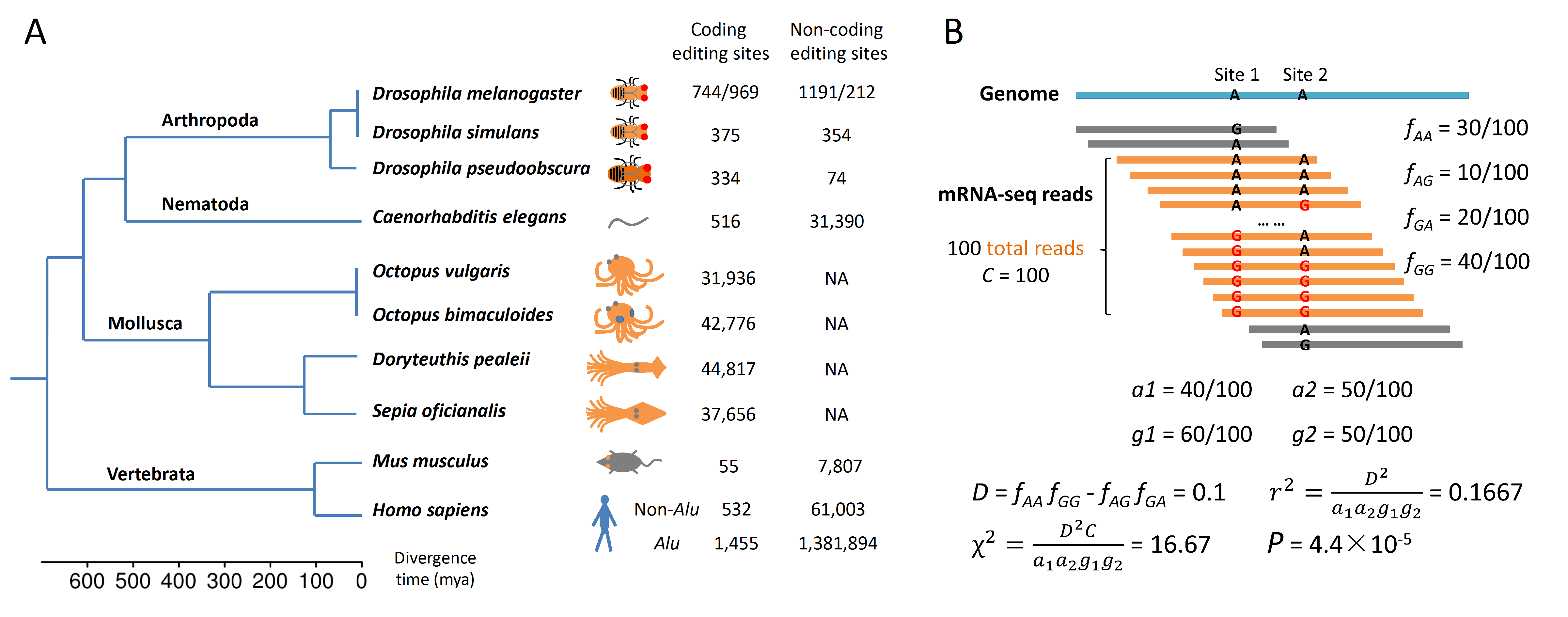 (A)本研究所用的十个后生动物物种;(B)根据二代测序数据计算两个RNA编辑位点连锁(r2)的方法。