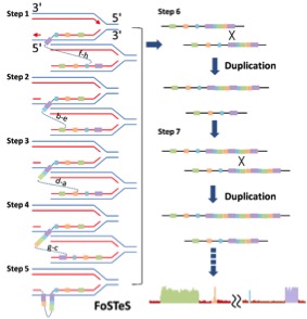 为了进一步阐述肿瘤细胞基因拷贝数异常形成的机制,作者团队对该病人癌基因MYC所在的8号染色体的4个拷贝数增加区域进行了单碱基水平的单细胞结构变异分析,并提出一个形成多区间拷贝数变异的两步模型: 首先在DNA复制过程中由于一系列的复制叉停顿和模板转位(FoSTeS)形成多区间拷贝数增加;随后通过同源重组(Homologous Recombination, HR)进一步将该区域扩增到较高的拷贝数,最终形成肿瘤细胞中异常的拷贝数模式。