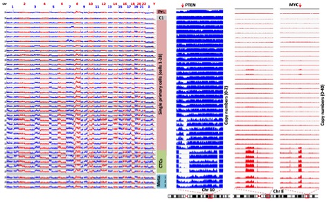 结直肠癌病人原发灶肿瘤单细胞,循环肿瘤细胞和转移灶癌组织基因组拷贝数模式以及PTEN,MYC基因拷贝数变化