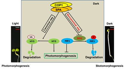 最近该研究团队发现,除作为E3泛素连接酶发挥功能外,COP1/SPA复合体在持续黑暗培养的植物幼苗中可通过非蛋白降解途径来抑制光形态建成。研究结果显示,COP1/SPA复合体可通过对植物激素油菜素内酯信号通路中重要负调控因子BIN2 (BRASSINOSTEROID-INSENSITIVE 2)的活性抑制,促进另一类光形态建成抑制因子中的PIF3 (PHYTOCHROME INTERACTING FACTOR 3)蛋白稳定性来发挥功能(图1)。BIN2 编码一个Glycogen synthase kinase 3类激酶,在黑暗条件下作用在COP1下游。研究发现BIN2是PIF3的一个激酶,黑暗条件下可直接介导其磷酸化与降解。这项研究在拟南芥中揭示了COP1抑制光形态建成的新作用层面,拓展了人们对于植物光形态建成精细调控的新认识。鉴于COP1在动植物体系中的功能重要性与保守性,该研究结果对于深入发掘动植物中COP1的新功能与作用机制提供重要启示。