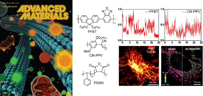 为了进一步提高超分辨成像的各项指标,迫切需要高量子产率、超高光稳定性和优异的生物兼容性的荧光探针。日前,冰球突破mg正规官网生物动态光学成像中心孙育杰课题组联合吉林大学吴长锋课题组在国际上首次研发成功适用于统计型超分辨成像的小尺寸光闪烁半导体聚合物量子点(Pdots),该探针具有高亮度、超高光稳定性和优异的生物兼容性等优势,并可以特异性地对生物亚细胞结构进行高密度标记,该工作成功取得超分辨率光学波动成像(SOFI)结果,打开聚合物量子点超分辨成像的新领域。最新研究成果在国际权威刊物《Advanced Materials》(先进材料,IF:18.96)上作为封面文章在线发表,同时被所有审稿人均评为VIP(Very Important Paper)文章。