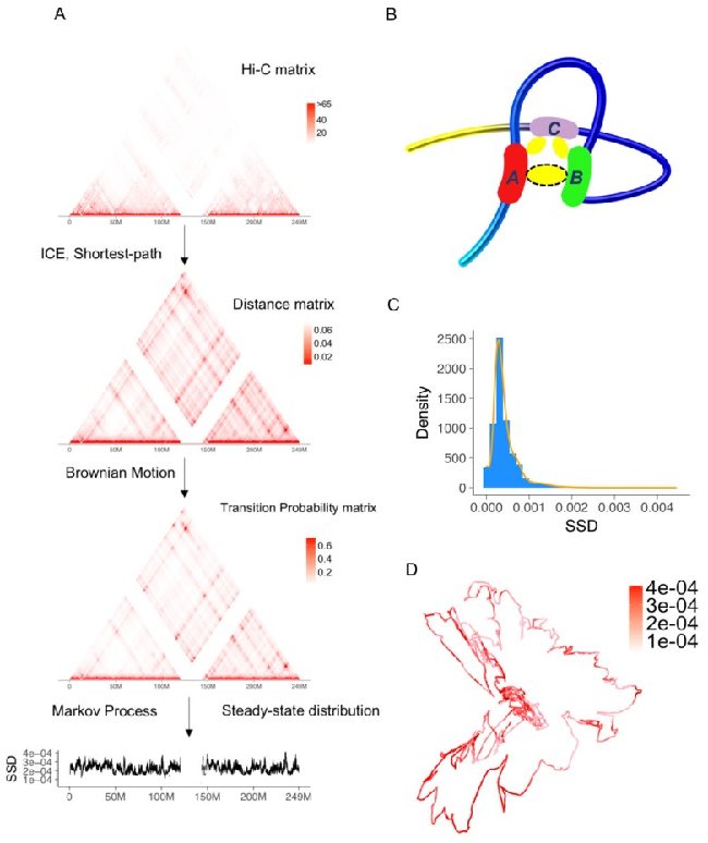 图1:动态染色质可接近性模型和性质。A:SSD的计算流程。Hi-C矩阵经过最短路径法转换得到染色质区域的空间相互距离,再利用分子布朗运动的假设,得到马尔可夫模型的状态转移概率,最后得到分子在不同染色质区域的平衡态分布。B:最短路径算法示意图。C:SSD值在染色质不同区域的典型分布。D:GM12878细胞系1号染色体基于Hi-C数据的三维结构模型与SSD(颜色)的关系。