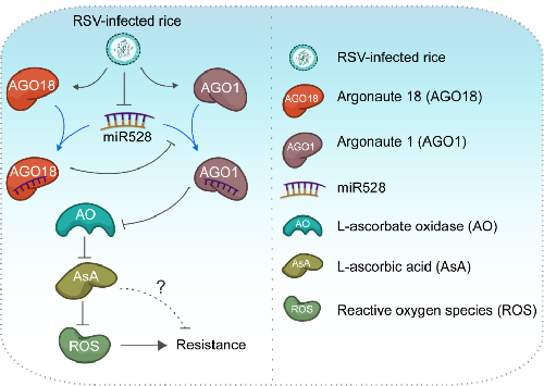 水稻作为重要的粮食作物长期以来受到多种病毒病的侵害,在实际中缺乏有效的控制方法。虽然,在模式植物抗病毒免疫方面有较多的研究。但是,对于单子叶禾本科作物的研究很少。本课题组先前的研究发现水稻AGO18蛋白能够通过竞争性结合miR168来保护AGO1,然后AGO1结合vsiRNA对病毒基因组RNA进行沉默,从而增强水稻的抗病毒防御反应,该发现于2015年2月在线发表于eLife杂志上。基于对AGO18的研究,本研究发现单子叶植物特有的miR528能够通过被AGO18竞争性结合,从而释放靶基因抗坏血酸氧化酶(AO),AO通过氧化抗坏血酸调节植物体内的氧化还原稳态,从而促进植物体内活性氧族(ROS)的积累启动下游的抗病毒通路。该研究成果进一步证明水稻AGO蛋白在水稻抗病毒防御中的重要作用,并且揭示了植物抗病毒防御网络的复杂与多样性,对于推进理解宿主通过RNA沉默抗病毒机理以及今后培育广谱抗病毒作物品种具有重要意义。