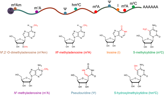 mRNA上的化学修饰 (图源于Nature Methods)