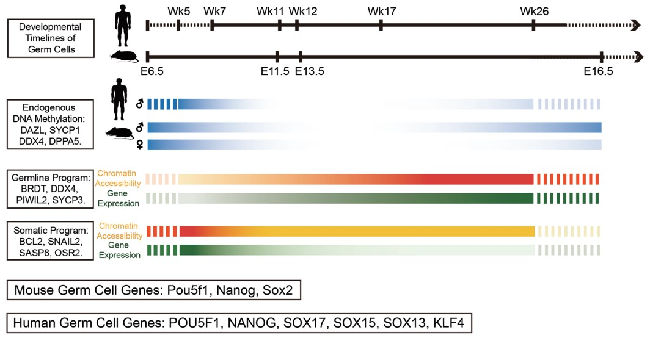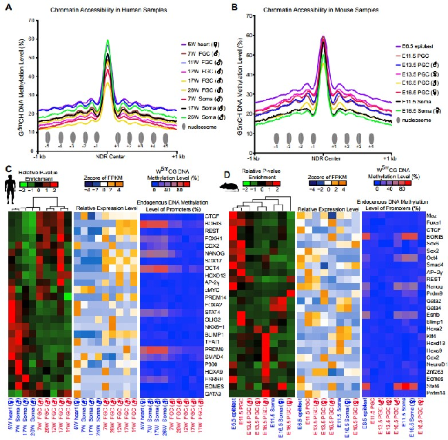 然而标准的在全基因组水平研究细胞染色质状态的方法需要用到大量细胞,很难在人类胚胎期生殖细胞这种稀少的材料中进行研究。在此项研究中两个课题组采用优化的NOMe-seq(全基因组核小体定位及DNA甲基化组测序)技术,同时分析了细胞的染色质状态组和内源DNA甲基化组的动态变化,再结合转录组测序,系统、深入地分析了人类早期生殖细胞多个关键发育阶段的染色质状态组以及DNA甲基化组的重编程过程,及其对基因表达的调控关系。同时也对相应发育阶段的小鼠早期生殖细胞进行了NOMe-seq分析,发现了人类和小鼠早期生殖细胞染色质状态组、DNA甲基化组与基因表达调控的进化保守性特征和物种特异性特征。通过此项研究,研究人员发现:(1)分别在人类和小鼠早期生殖细胞中鉴定出了116,887和137,557个染色质开放区域(也叫核小体缺失区域,nucleosome-depleted regions (NDRs)),其中84,834个(人类)和109,264个(小鼠)为远离转录起始位点的染色质开放区域。这些大部分是候选增强子元件,为该领域提供了一个丰富、精准的关键染色质调控区域的数据集;(2)在人类和小鼠早期生殖细胞中远离转录起始位点的染色质开放区域强烈富集多能性干细胞以及生殖细胞特异性转录因子的结合位点,比如人类的OCT4, NANOG, SOX17,小鼠的Oct4, Nanog, Sox2等转录因子的结合位点,说明这些关键转录因子对于维持生殖细胞特异的基因表达网络起了重要的调控作用。特别是SOX17的调控序列只在人类早期生殖细胞NDR区域特异性富集,而Sox2的调控序列只在小鼠早期生殖细胞NDR区域特异性富集。相应的SOX17特异性地在人类早期生殖细胞中表达,而Sox2特异性地在小鼠早期生殖细胞中表达,反映了早期生殖细胞中SOX家族转录因子的表达和靶基因调控的物种特异性特征;(3)SVA重复序列是人类等灵长类动物基因组高度富集的,而在小鼠基因组中很少。与周围的微环境体细胞相比,基因组中的SVA重复序列在人类早期生殖细胞中特异性地呈现更加开放的染色质状态,相应的SVA重复序列的转录本也在这些早期生殖细胞中特异性地高表达;(4)之前该课题组的研究报道了在人类着床前胚胎以及着床后的早期生殖细胞基因组DNA去甲基化过程中,年轻的重复序列(比如LINE-1和Alu)倾向于保留更多DNA甲基化修饰来抑制其转录活性(Guo et al.Nature, 2014; Guo et al.Cell, 2015),而在此项新研究中不仅验证了这一现象,而且更进一步发现在人类早期生殖细胞基因组DNA去甲基化过程中,这些年轻的重复序列倾向于维持关闭的染色质状态,保留更多的剩余DNA甲基化,以此共同抑制其转录和转座活动,从而维持生殖系细胞基因组的稳定性。