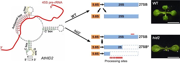 最近,这个研究团队聚焦拟南芥snoRNA的功能机制,通过综合运用分子遗传学与生物化学分析法,发现并解析了一个参与植物核糖体生物合成的重要非编码类型调控因子HID2 (HIDDEN TREASURE 2 )。研究首先结合前期对snoRNA的系统注释,通过大规模反向遗传学筛选获得了突变体hid2,其中主效因子HID2表达显著下降。hid2突变体幼苗和成株均具有明显生长发育缺陷,其表型与核糖体大、小亚基的编码基因突变体类似。HID2在拟南芥中编码一个C/D box snoRNA, 在植物细胞分裂旺盛区域呈特异性表达,并定位于细胞核仁区。运用多种RNA生物学方法,研究人员发现HID2主要通过与核糖体RNA (ribosomal RNA, rRNA)最初前体45S pre-rRNA结合,确保pre-rRNA准确且有效的加工为成熟形式,进而保证核糖体的精确装配和植物正常的生长发育。此外,该研究确定了HID2发挥功能的关键序列元件,并发现该序列元件在包括酵母、线虫、果蝇、小鼠和人在内几乎所有真核生物中具有保守性,提示HID2的功能和机制具有潜在的普适意义。
